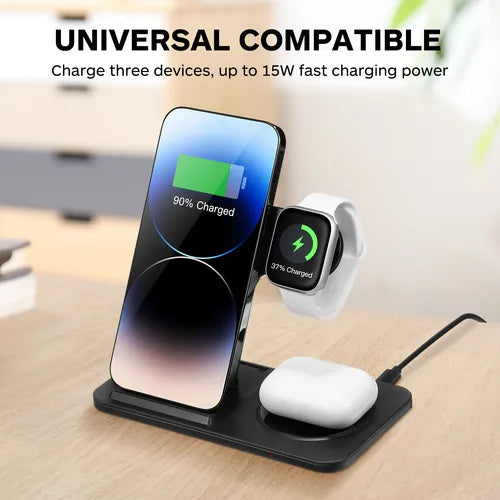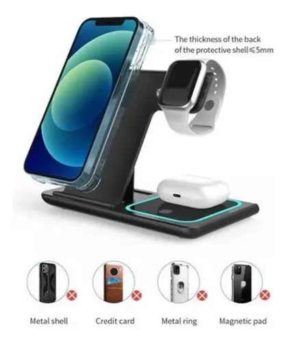 cargar simultáneamente Soporte de cargador inalámbrico 4.3 en 1. El cargador inalámbrico Qi adopta una alta eficiencia de carga. Carga inalámbrica rápida de 15 W para Samsung S21, S20, S20 +, S20 Ultra, Huawei P40 Pro, P30 Pro, Mate 40 Pro, Mate 40 Pro+/Mate 30, Mate 30 Pro, Mate 20 Pro. Carga inalámbrica de 10 W para Samsung Galaxy Note9/Note 10/Note 10 Plus/S10/S9/S8/S7/S7 Edge. Modos de carga rápida de 7,5 W para iPhone 12/12 Pro/12 Pro Max/12 mini/SE2/8 Plus/X/XR/XS Max/11 Pro/11/11 Pro Max. La carga inalámbrica se puede cargar con dos teléfonos al mismo tiempo. Almohadilla de carga inalámbrica de 5 W para teléfono o Airpods Pro. Especificaciones: Nombre: Cargador inalámbrico 3 en 1 Calidad del material: lente acrílica plástica Color: negro, blanco Interfaz: Tipo-c Corriente de entrada: 5V-3A, 9V-2A, 12V-1 5A Salida inalámbrica: 15 W, 10 W, 7,5 W, 5 W Requisitos del adaptador: 9V-2A Compatibilidad: teléfonos móviles, para relojes Apple Auriculares Bluetooth que cumplen con los estándares Qi Tamaño del producto: 165* 141,3* 13 mm El paquete incluye: 1* cargador inalámbrico 1* cable de carga tipo C (adaptador de pared no incluido) 1* Manual del usuario