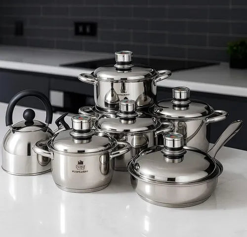 La bateria cuenta con un termo-difusor de calor que distribuye de manera uniforme el calor a toda la olla así la llama del fogón sea pequeña todas las piezas de las ollas son 100% acero quirurgico tanto las manijas como las tapas,